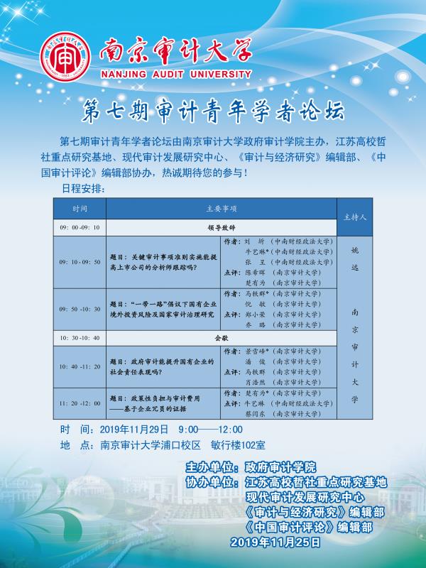 第七期审计青年学者论坛,第七期审计青年学者论坛有h漫画 政府审计学院主办,江苏高校哲社重点研究基地、现代审计发展研究中心、《审计与经济研究》编辑部、《中国审计评论》