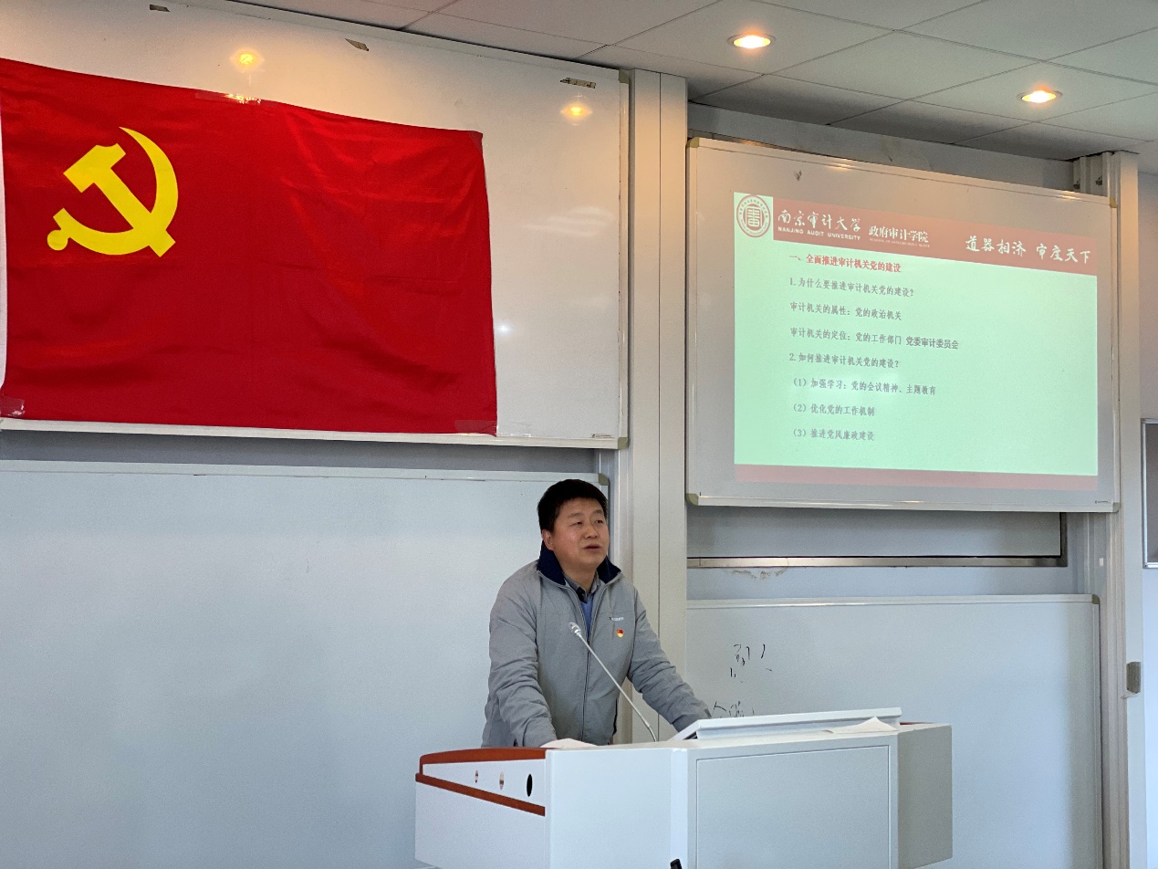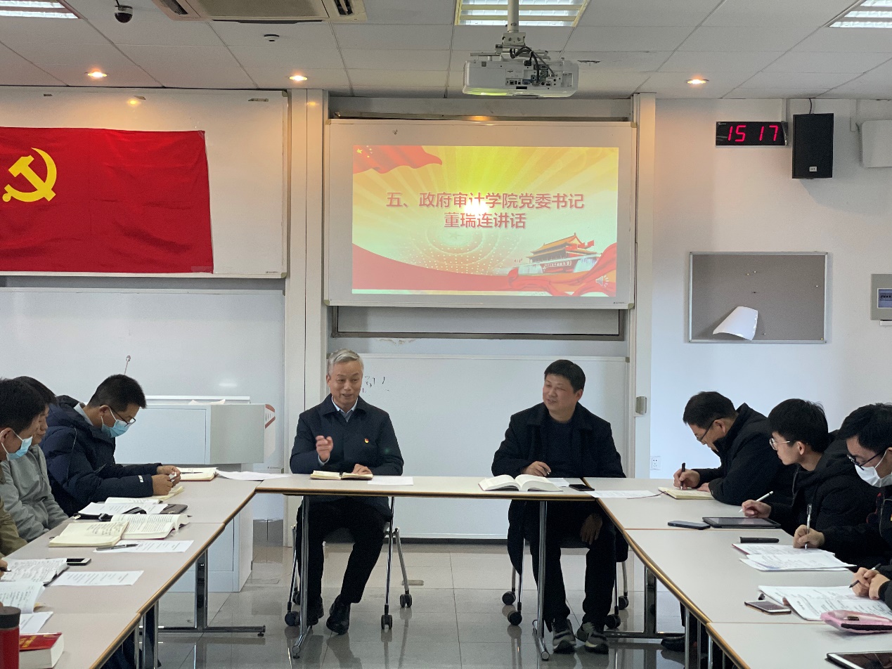 政府审计学院教工第二支部书记陈希晖首先领学《中国共产党领导下的审计工作史》第十章第四节“全面推进审计机关党的建设和审计干部队伍建设”、《审计署关于努力建设高素质专业化审计干部队伍的意见》等内容,解读了审计机关加强党的建设和审计干部队伍建设的必要性和路径,分享了学习体会,并结合党中央对审计干部队伍的素质要求,帮助审计专业学生明确大学生涯目标和实现路径。