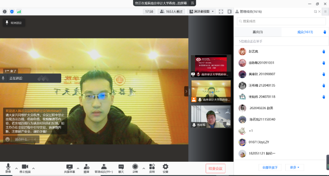 2月26日晚,h漫画 政府审计学院邀请陈希晖副教授通过线上方式参与“师友同行”系列活动,以“学习贯彻审计法,树立依法审计理念”为主题,分享对新修订审计法的解读。讲座持续了两个小时,来自西南财经大学、中南财经政法大学、上海立信会计金融学院、浙江财经大学、浙江工商大学、湘潭大学等校本科生和研究生也都参与其中,累计1934人参加讲座,实时点赞18.6万,产生了良好的效果,也为“师友同行——共话审计法”征稿活动充分预热。