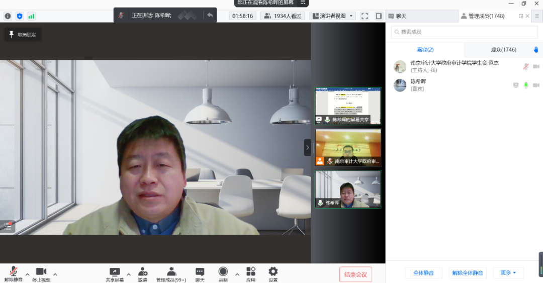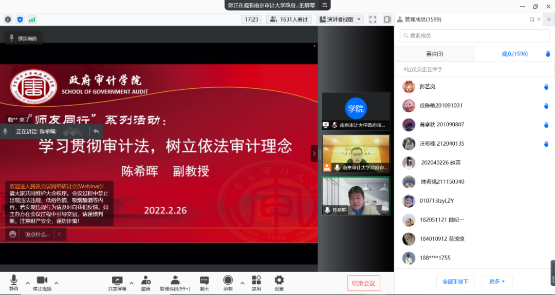2月26日晚,h漫画 政府审计学院邀请陈希晖副教授通过线上方式参与“师友同行”系列活动,以“学习贯彻审计法,树立依法审计理念”为主题,分享对新修订审计法的解读。讲座持续了两个小时,来自西南财经大学、中南财经政法大学、上海立信会计金融学院、浙江财经大学、浙江工商大学、湘潭大学等校本科生和研究生也都参与其中,累计1934人参加讲座,实时点赞18.6万,产生了良好的效果,也为“师友同行——共话审计法”征稿活动充分预热。