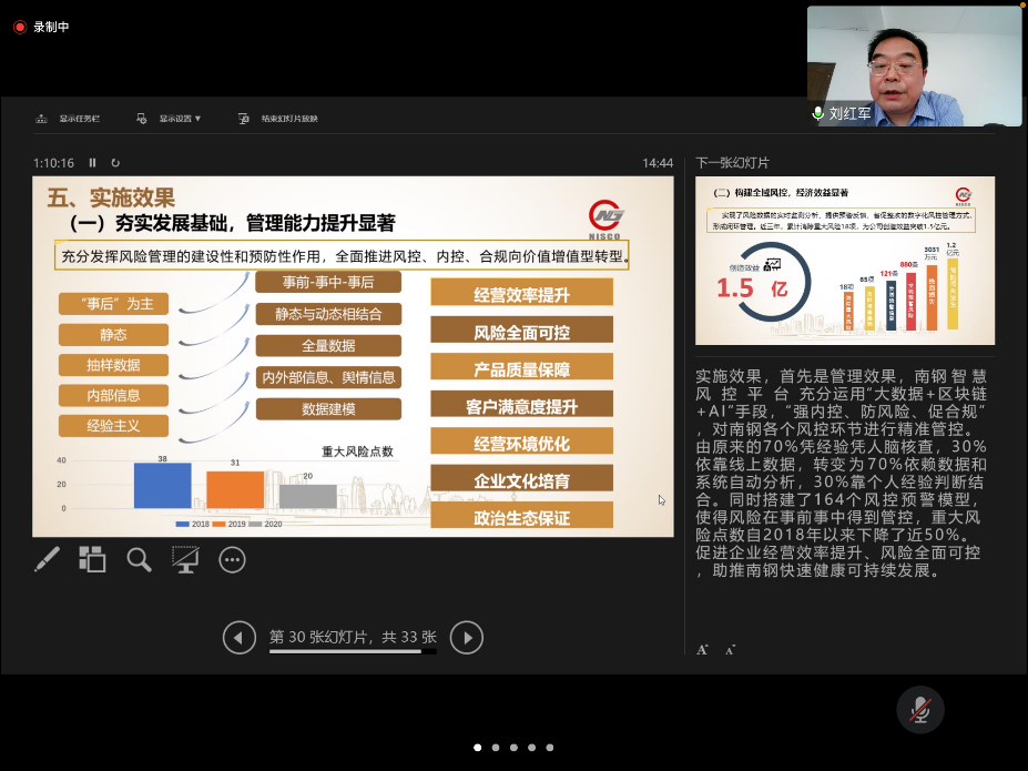 本次讲座刘部长围绕南钢内审部门信息化建设问题与对策、南钢智慧风控建设背景、主要内容、主要做法及实施效果五个部分展开。
