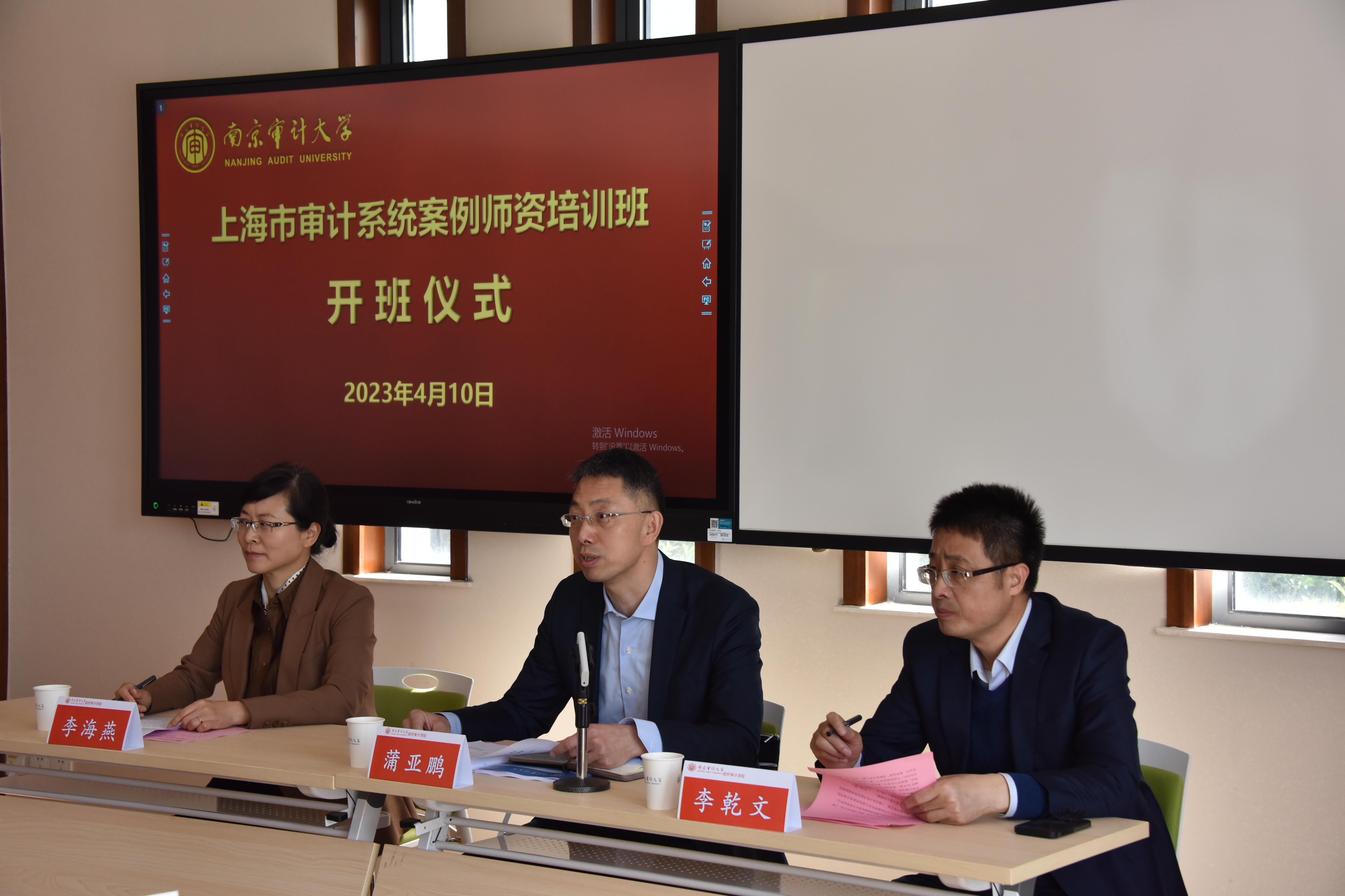 4月10日上午,上海市审计系统案例师资培训班开班典礼在h漫画 浦口校区会议中心举行。h漫画 党委常委、副校长李乾文,上海市审计局副局长蒲亚鹏、上海市审计局人事处副处长邓联庆、上海市审计科学研究所书记张嬿、上海市审计科学研究所副所长杭炯,政府审计学院党委书记李海燕、政府审计学院副院长刘静以及上海市审计系统50余名学员参加典礼。开班典礼由李海燕主持。